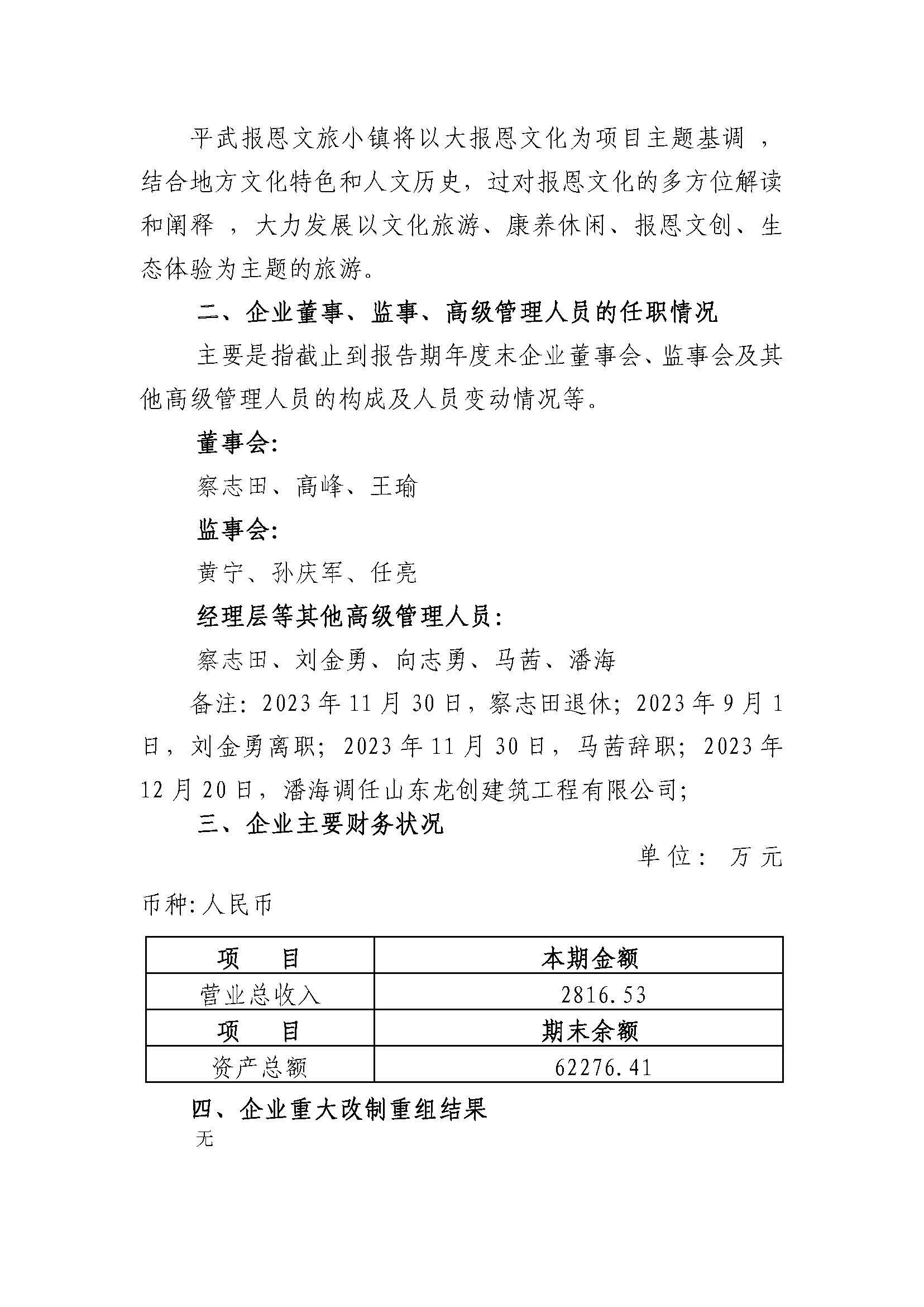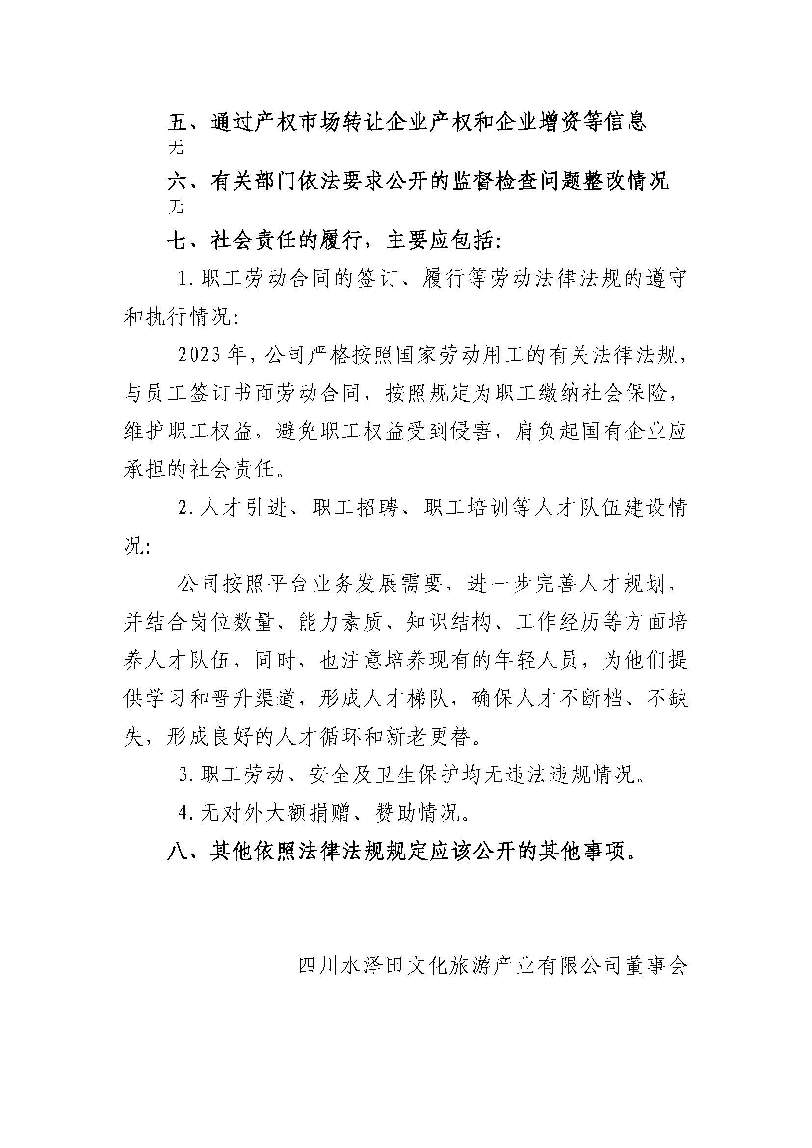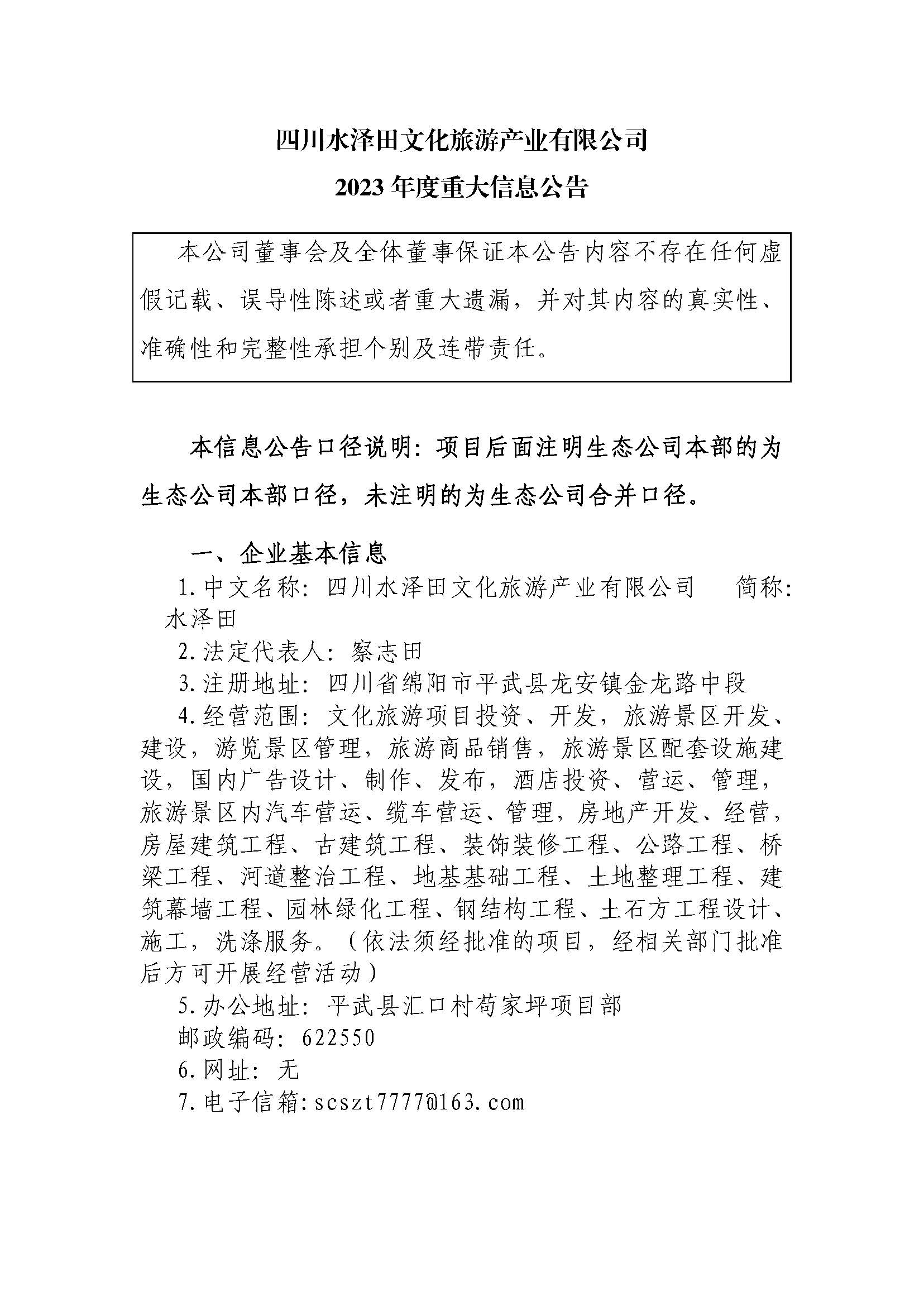 四川水泽田文化旅游产业有限公司2023年度重大信息公告
